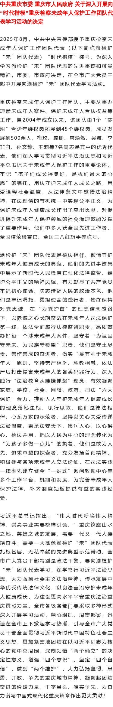 【新重庆】中共重庆市委 重庆市人民政府 关于深入开展向“时代楷模”重庆检察未成年人保护工作团队代表学习活动的决定
