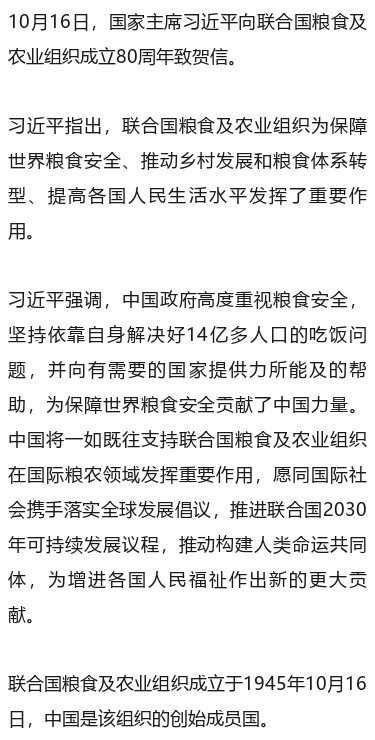 习近平向联合国粮食及农业组织成立80周年致贺信