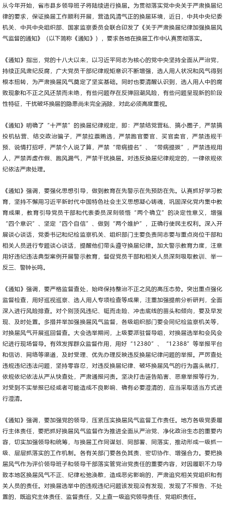 中共中央纪委机关、中共中央组织部、国家监察委员会联合印发《关于严肃换届纪律加强换届风气监督的通知》
