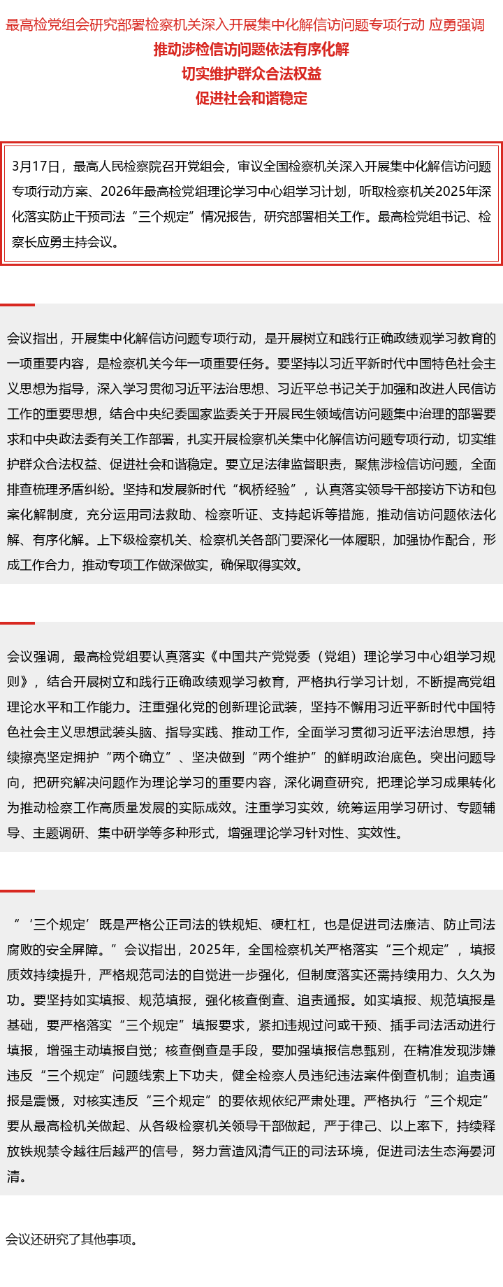 最高检党组会研究部署检察机关深入开展集中化解信访问题专项行动