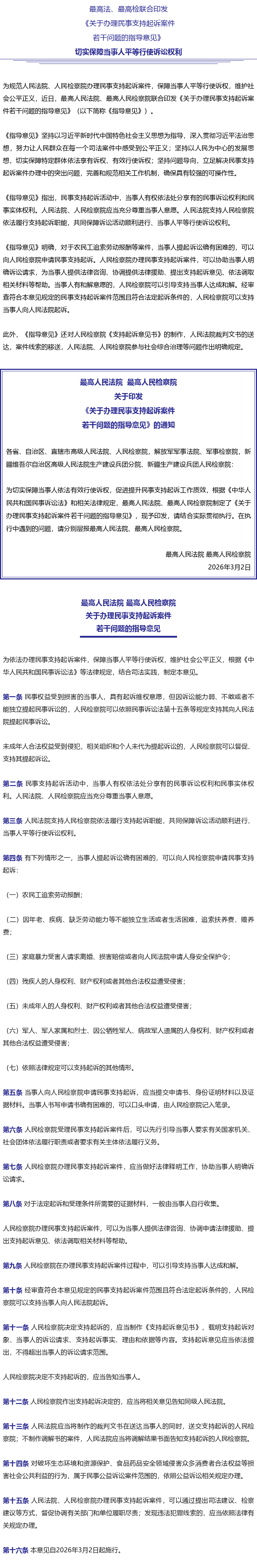 最高法、最高检联合印发《关于办理民事支持起诉案件若干问题的指导意见》