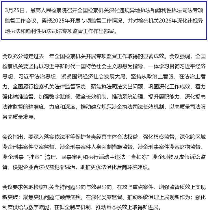 最高检部署深化违规异地执法和趋利性执法司法专项监督