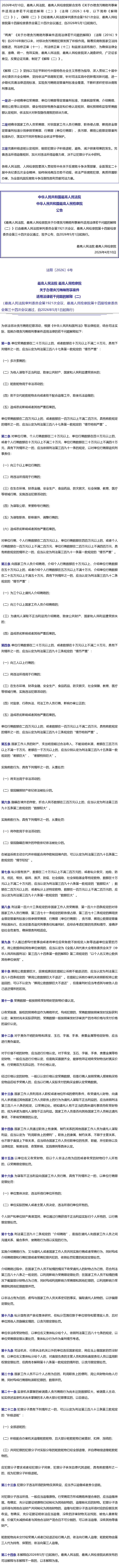 “两高”发布《关于办理贪污贿赂刑事案件适用法律若干问题的解释(二)》