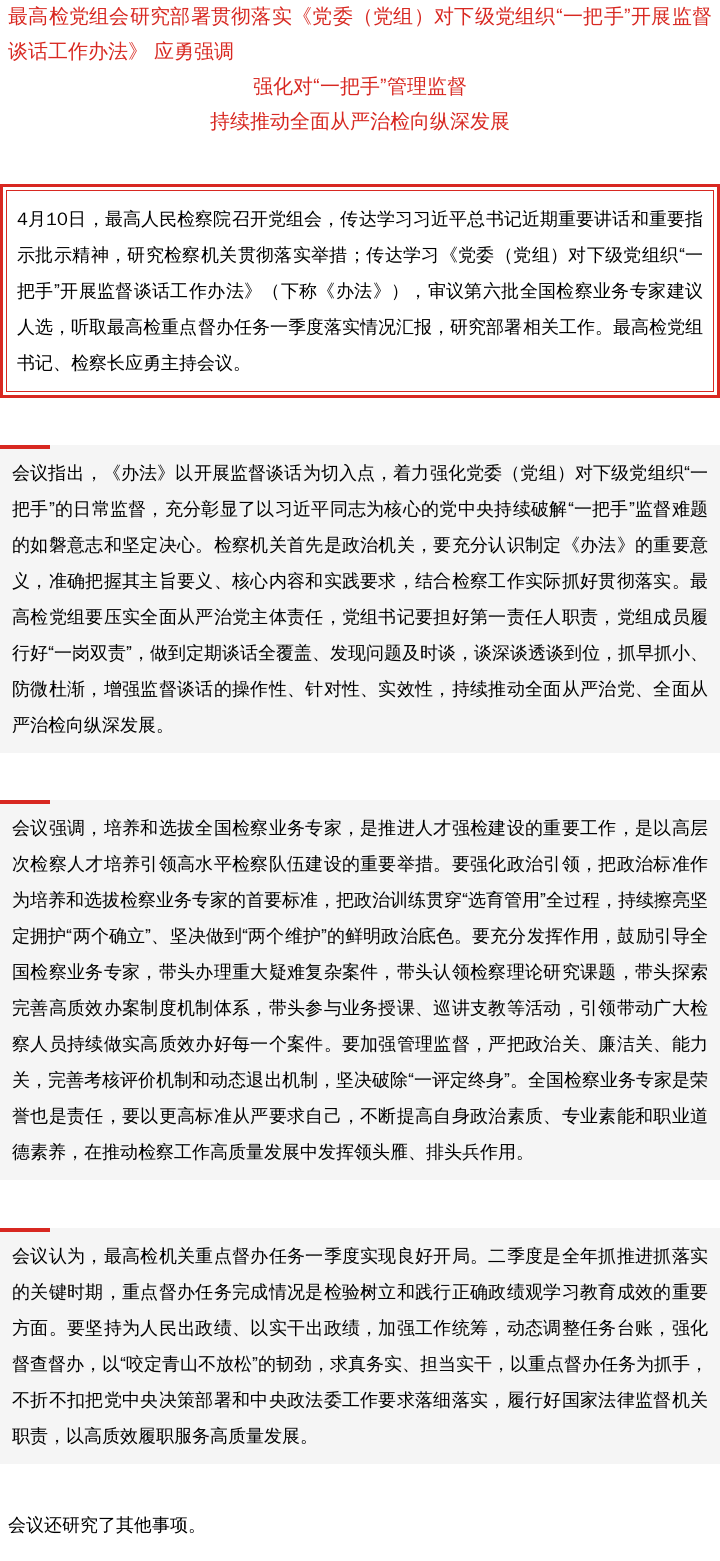 最高检党组会研究部署加强对机关党组织“一把手”管理监督等工作