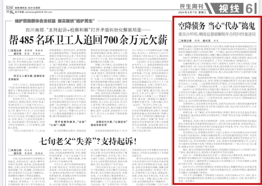 2024年8月7日,《检察日报》第6版刊登《空降债务 当心“代办”捣鬼——重庆沙坪坝:精准监督破解购车合同纠纷案迷局