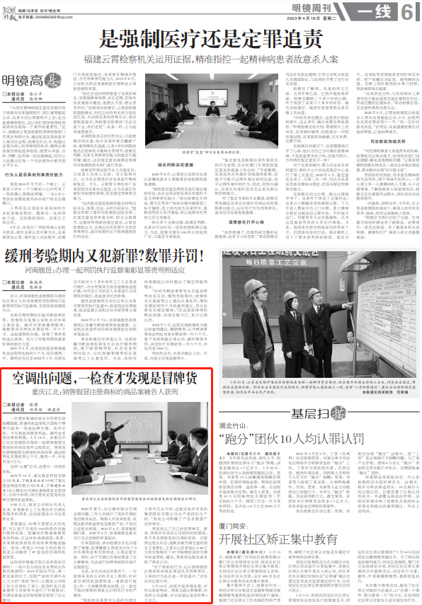 2023年4月18日,《检察日报》第6版刊登《空调出问题,一检查才发现是冒牌货——重庆江北:销售假冒注册商标的商品案被告人获刑》一文,内容如下: