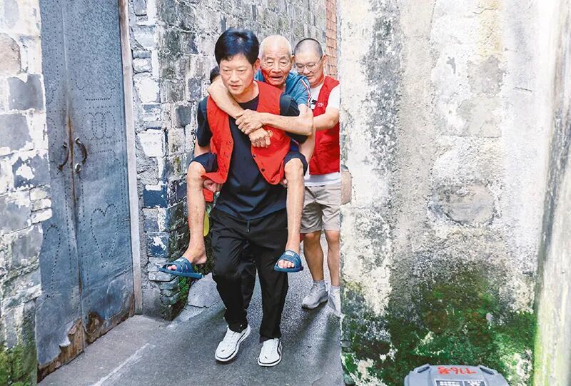 新时代以来,广大党员干部注重走好新时代群众路线,不断把我们党密切联系群众的优良作风发扬光大。图为2024年9月19日,台风“普拉桑”逼近我国华东沿海,浙江省诸暨市赵家镇泉畈村村干部和党员志愿者在台风来临前转移老旧房里的老人。 新华社记者 徐昱/摄