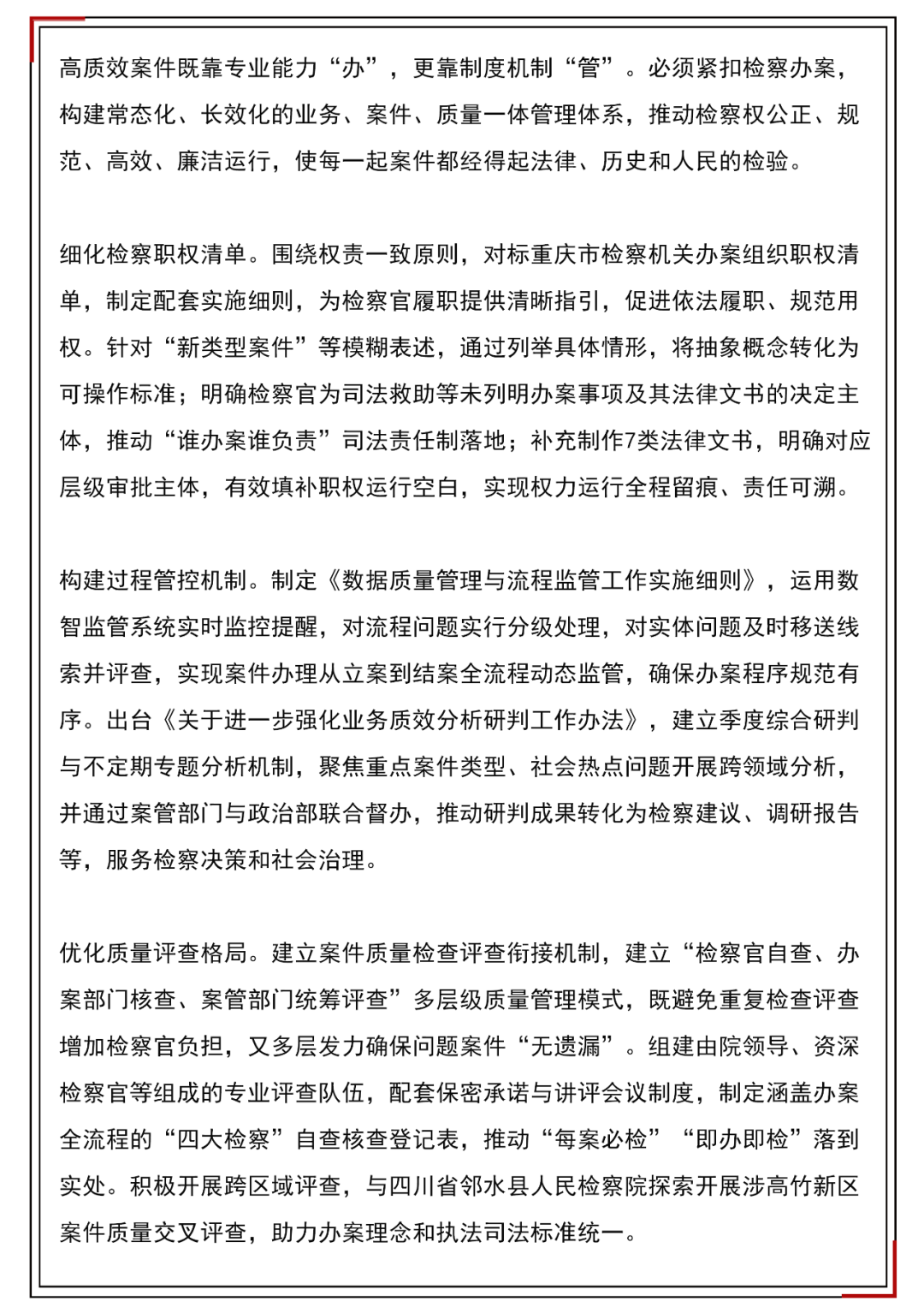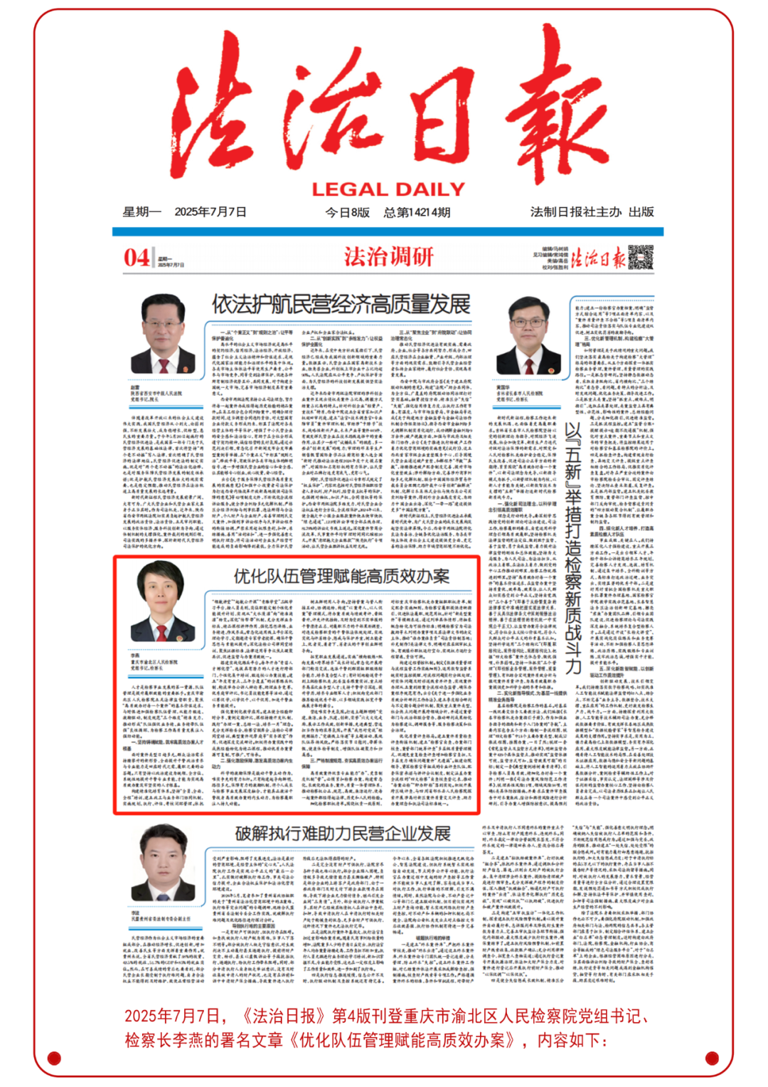 人才是检察事业发展的第一资源,队伍管理是提升履职效能的重要抓手。重庆市渝北区人民检察院立足法律监督职责,聚焦“高质效办好每一个案件”的基本价值追求,与时俱进加强检察队伍管理,从能力锻造、激励驱动、制度规范“三个维度”精准发力,推动形成“队伍强促业务精、业务精带队伍强”良性循环,为检察工作高质量发展注入强劲动能。