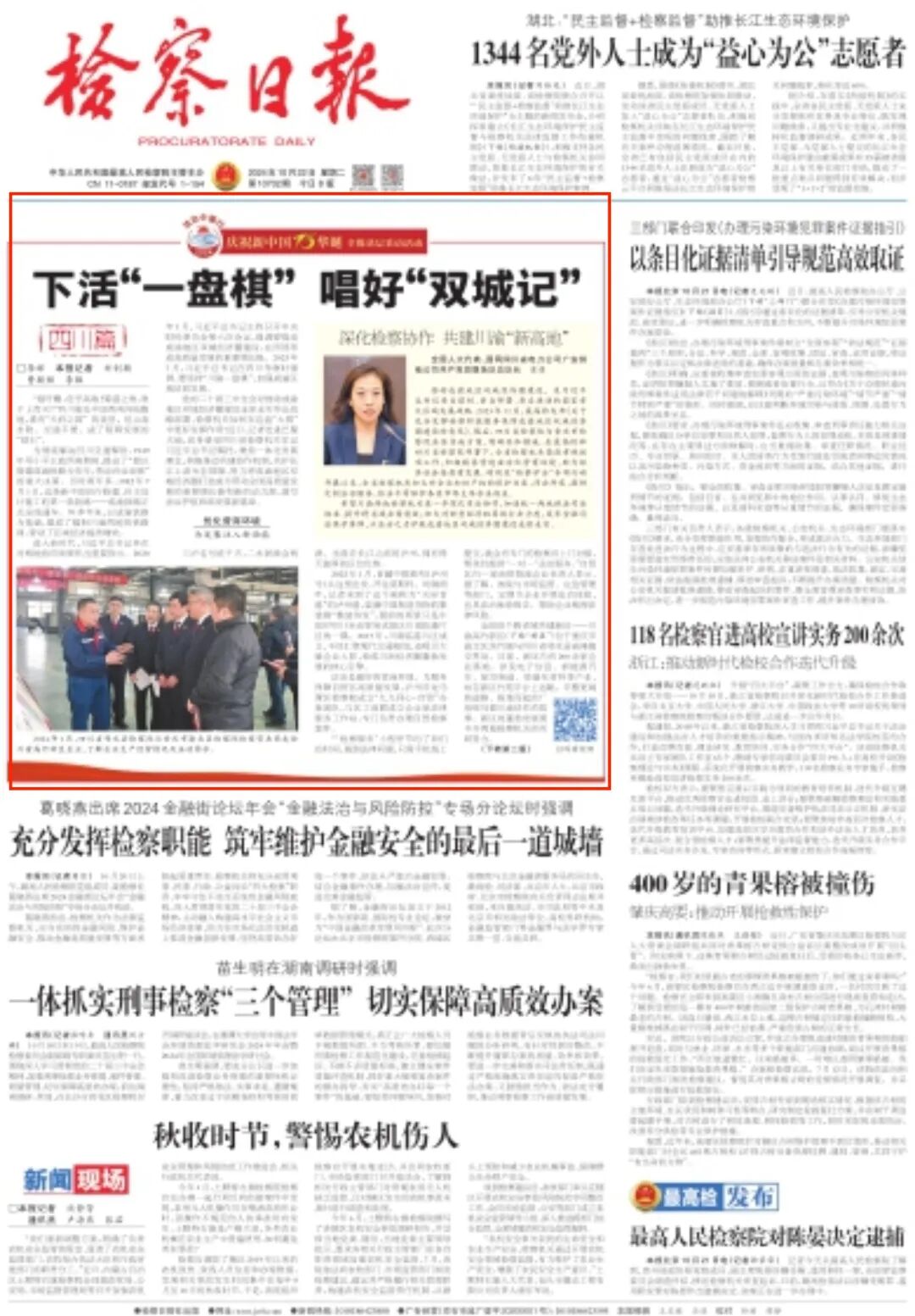 “成渝地区双城经济圈建设国家战略从顶层设计的‘大写意’到落地实施的‘工笔画’,两地检察机关协作越来越紧密,在平安建设、营造法治化营商环境、金融检察等领域取得系列成果。下一步,要深入推进‘检察护企’专项行动,服务经济社会发展;深入推进川渝毗邻地区检察一体化履职,服务创新驱动发展;聚焦企业所需,推进知识产权检察综合履职,为培育新质生产力保驾护航。”四川省检察院党组书记、检察长王麟表示。